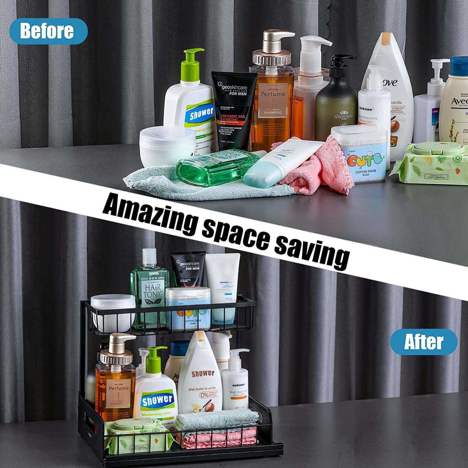 *2 Tier Organizers*:Designed with double layers; this organizer makes full use of vertical space. Come with upper fixed basket and bottom sliding out basket with handle slots; which allows you to easily fetch and place items.